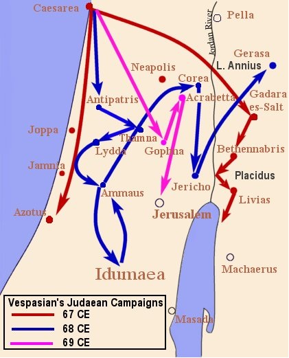 During the Jewish War the Roman army set-up camp all throughout Israel with its major camp being in Caesarea. Josephus says that the middle of the Roman camp was “set apart for tents. . . . [with] the tents of the commanders in the middle; but in the very midst of all is the general’s own tent, in the nature of a temple . . .”30 As predicted in v. 45, just as the Roman military campaign was coming to its climax with the surrounding areas around Jerusalem being subdued, Vespasian then began preparations to move in to besiege Jerusalem, “the beautiful holy mountain.” It while Vespasian was preparing to besiege Jerusalem that news reached the army at Caesarea that the infamous emperor died. Caesarea is between the Mediterranean Sea, the Sea of Galilee and the Dead Sea and Jerusalem in fulfillment of v. 45: “And he will pitch the tents of his royal pavilion between the seas and the beautiful Holy Mountain; yet he will come to his end, and no one will help him”31